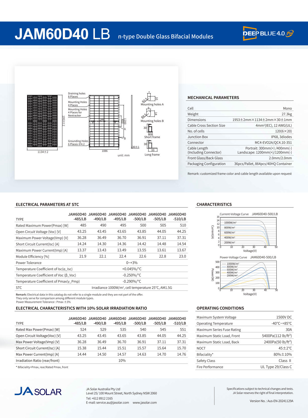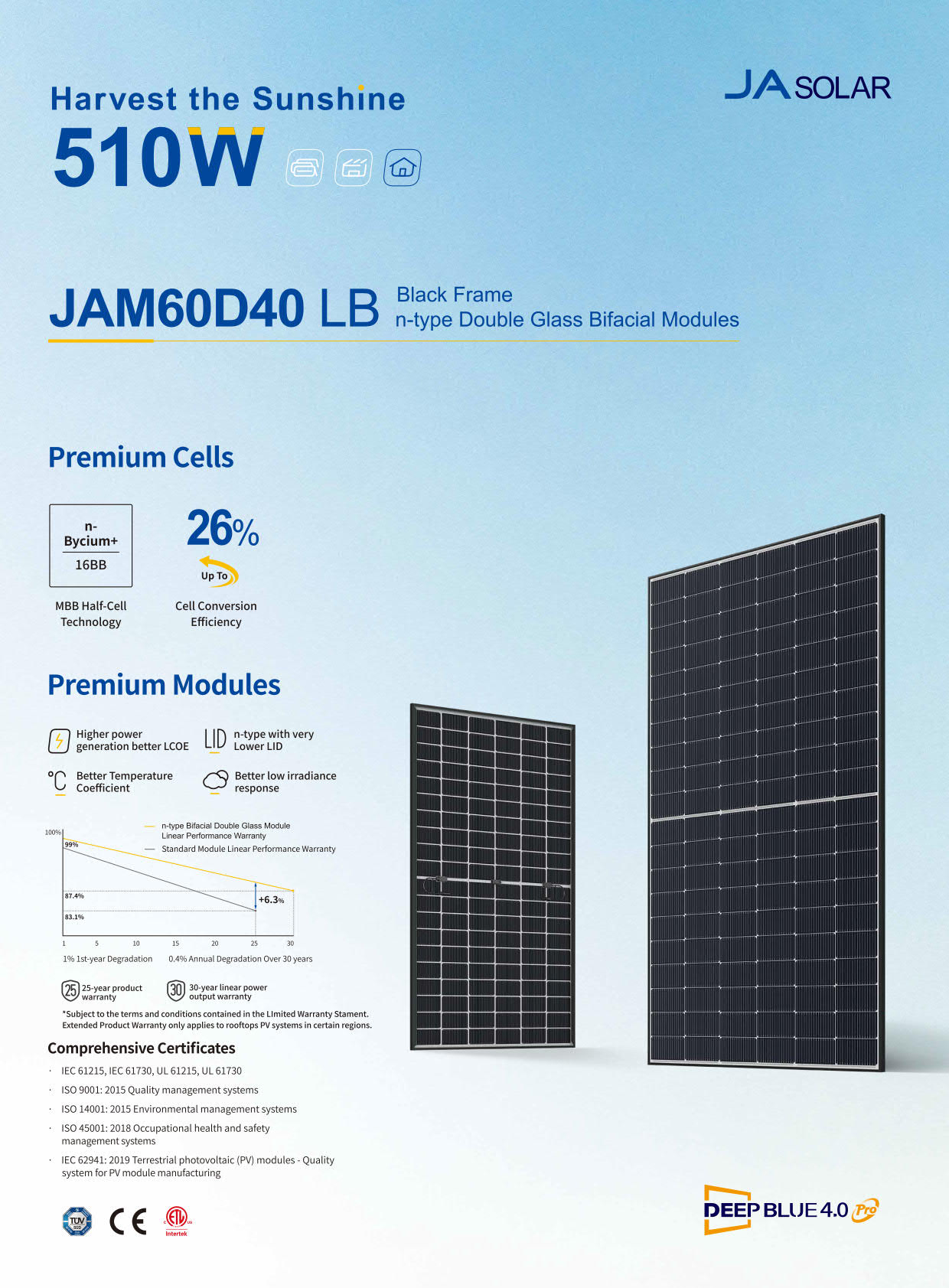 JA solar 500W N-Type Black Frame Dual Glass Bifacial Solar Module 1953*1134*30mm