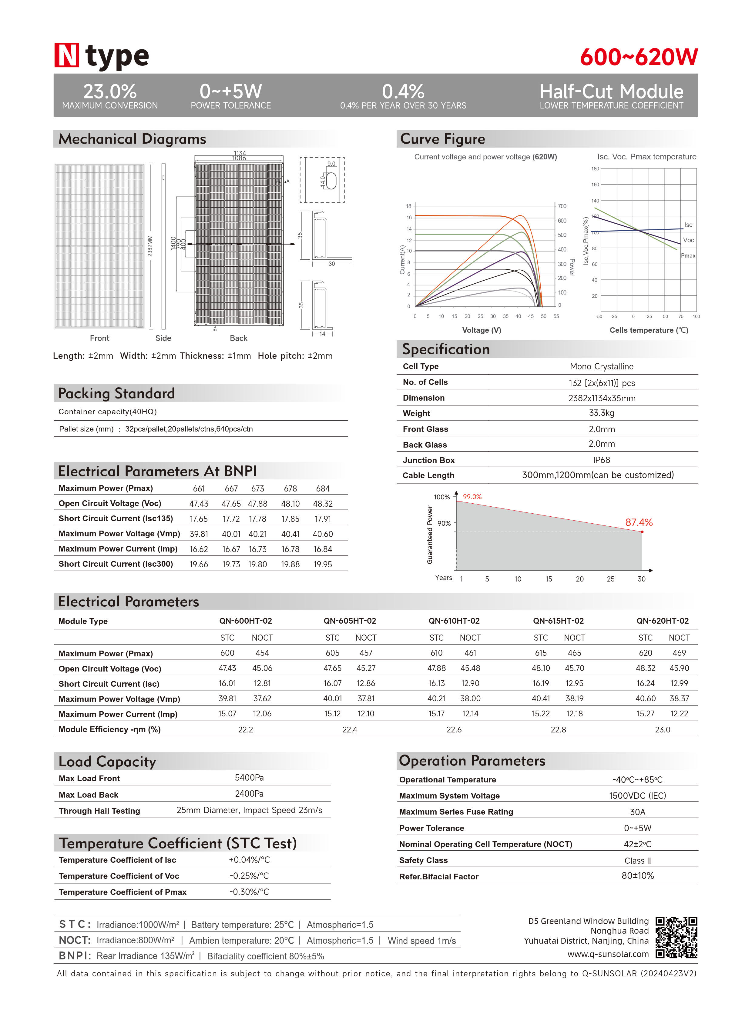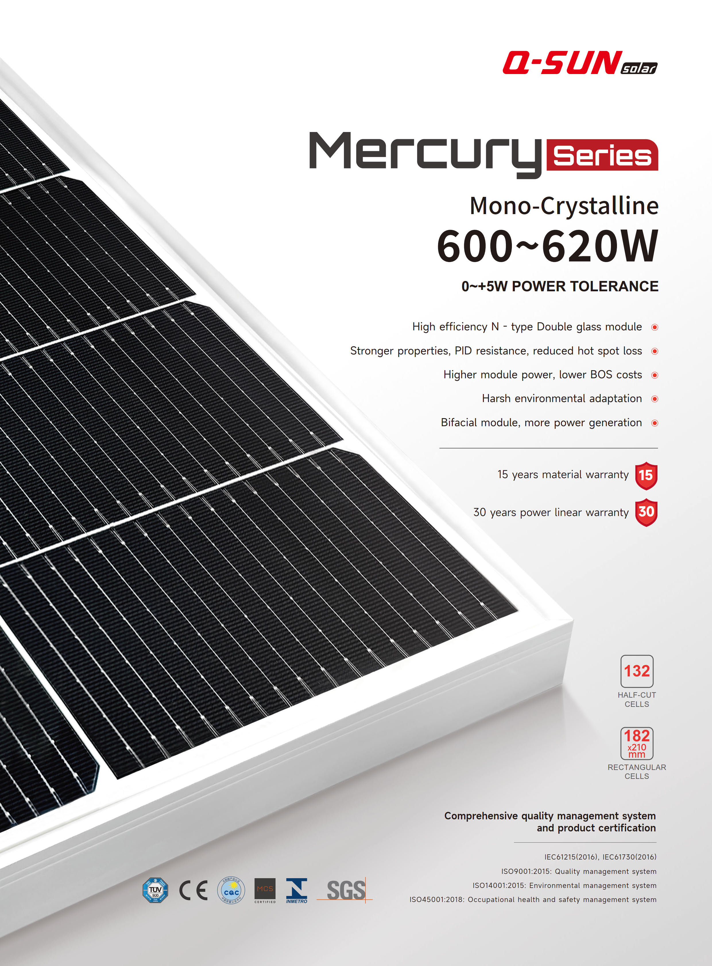 Q-SUN Solar 620W N-Type Silver Frame Bifacial Dual Glass Solar Module 2382*1134*35mm